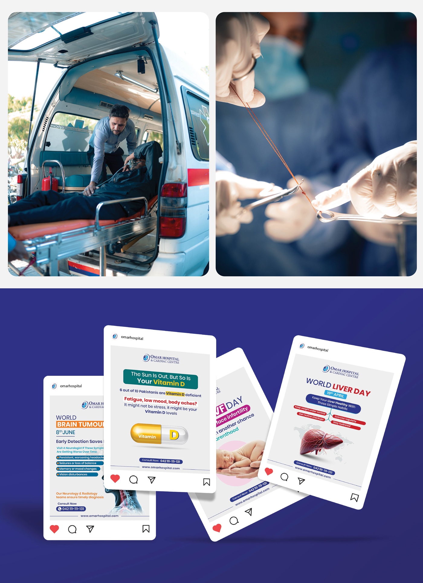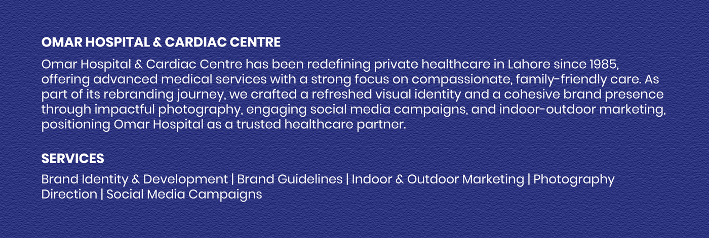 Omar Hospital & Cardiac Centre has been redefining private healthcare in Lahore since 1985, offering advanced medical services with a strong focus on compassionate, family-friendly care. As part of its rebranding journey, we crafted a refreshed visual identity and a cohesive brand presence through impactful photography, engaging social media campaigns, and indoor-outdoor marketing, positioning Omar Hospital as a trusted healthcare partner.